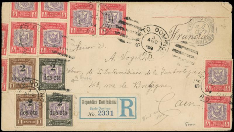 102 : 24 ex. en paires, N°121 (2) et N°122 (2), tous obl. SANTO DOMINGO 3/8/04 s. Env. Rec., arr. Caen 3/9, 4 ex. pliés sur la tranche, TB (Image)