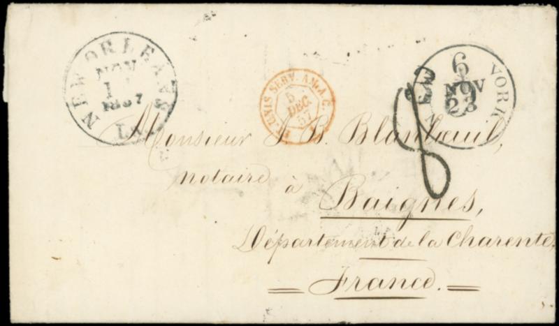 LAC du Consulat de France de la Nouvelle Orléans 10/11/57, passage NY 23/11, càd rouge ET.UNIS SERV.AM.A.C. 5/12/57, Taxe 8, arr. Baignes 7/12/57, TB (Image)