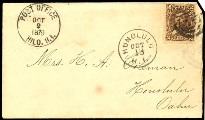 2 C. braun auf Brief von HILO nach HONOLULU, Marke entwertet mit schwarzem Killer-Stempel und nebengesetzter seltener Stempel "POST OFFICE/OCT/9/1879/HILO H.I." in schwarz, Ank.-Stempel vs. , tadellose Bedarfserhaltung (Image 1)(Image)