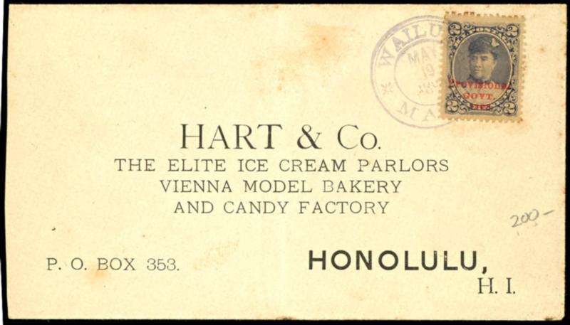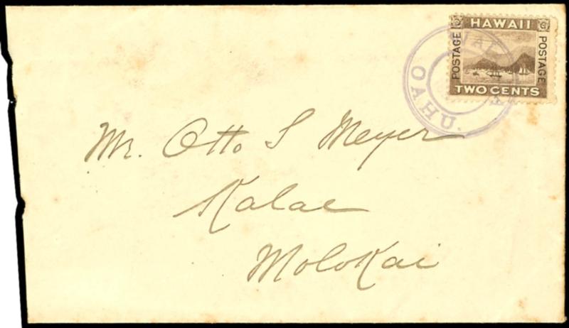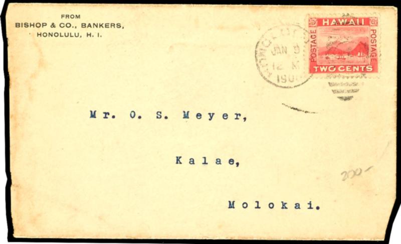 HONOLULU - clear single circle postmark on companies letter from 9.1.1900, franked with 2 C. Carmine rose to Kalae / Molokai, reverse violet arrival postmark LAUNAKAKEI / MOLOKAI, letter left a little rough opening and small tear (64)