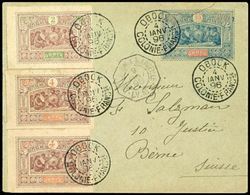 1896, 15 C Ganzsacheumschlag gebraucht, aufgewertet mit 2 C und 2 x 4 C somalischen Kriegern, entwertet mit OBOCK COLONIE-Frances, per französischer Schiffspost und Dschibuti nach Bern mit Ankunftsstempel, gute Erhaltung. (Image 1)(Image)