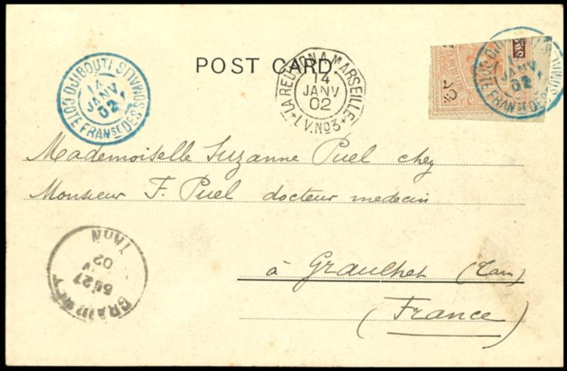 1902, 20 C. Somalischer Krieger halbiert auf Karte (Cafeé Arabee) aus Dschibuti per französischer Schiffspost nach GRAULHET / Frankreich mit Ankunftsstempel (Image 1)(Image)