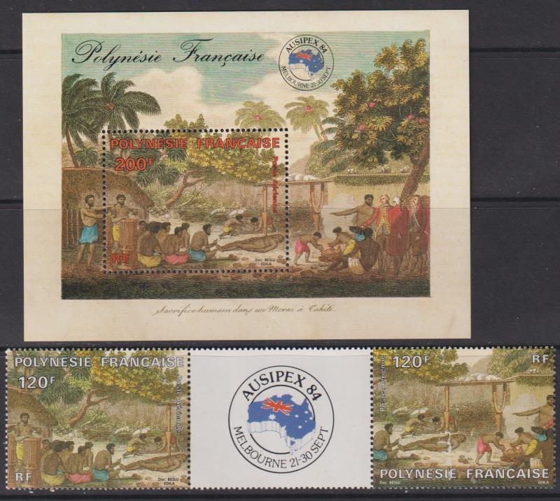 French Polynesia 1984 "Ameripex" Intl Stamp Exbn set of 2 x 120F (18th century painting by John Webber) in setenant strip with central commem label & 200F m/s (incl Captain James Cook observing native ceremony). SG 430-2. Cat £34. MUH. (Image)
