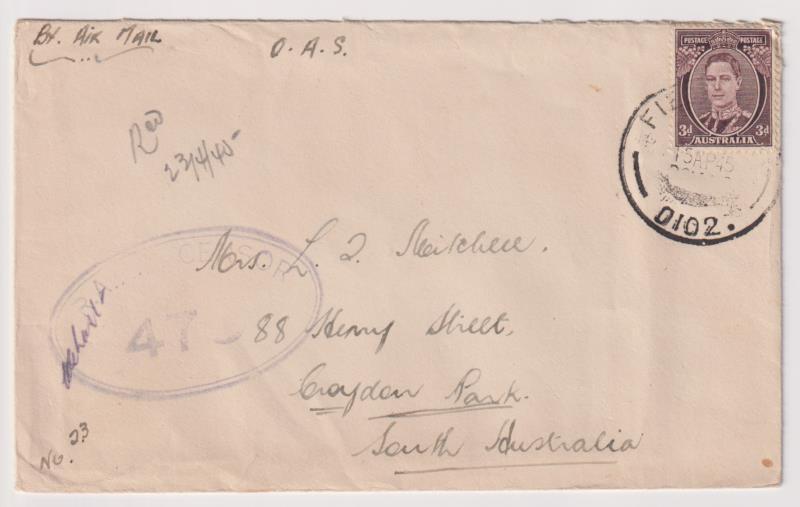 New Guinea 1945 WWII OAS air cover to Australia, with Aust GVI 3d, canc fair-good "FIELD P.O. 0102" cds 15 AP 45 ("0102" is very clear). Also with good oval "R.A.A.F. CENSOR" h/s (violet). At this time (Sept 1944-April 1945), the FPO 0102 cds was at Gre (Image)