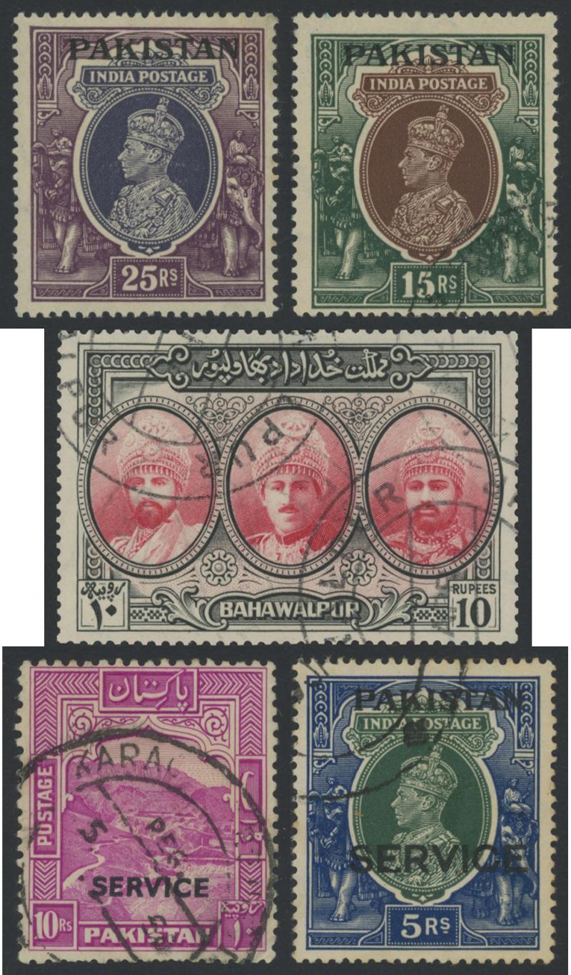 Selection on leaves from 1947 Overprints on India KGVI Heads 3p to 14a * & 1r to 25r ** and 2r to 25r used (extra 10r) plus 'SERVICE' overprints 1r, 2r & 5r used, 1948-57 Pictorials set */** plus 10r Perf 12 *, 15r Perf 13 * & used and 25r Perf 12 & Perf 13 * and 'SERVICE' overprints 10r * & 25r used, also Bahawalpur 1948 Pictorials set */** & used, 1948 Pictorials New Colours set used and Officials 1945 set ** (tropicalised gum) & 1948 set used, some of these with possibly dubious cancels, also 1933 British-Bahawalpur Alliance Cinderella label single & block of 4 **, condition generally fine to very fine, Cat £2500+.