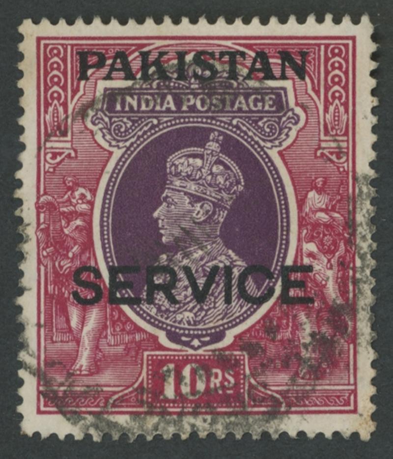OFFICIAL STAMPS: 1947 'PAKISTAN/SERVICE' Overprints on India KGVI 10r purple & claret SG O13, well-centred, light but slightly indistinct cds cancel, Cat £180. (Image1)
