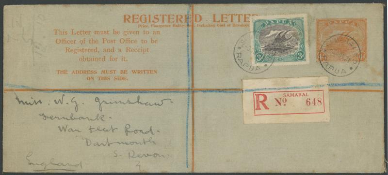 1903 (Jan 23) double-rate cover to "Walter A Hull/Stamp Dealer/.../Sydney" with BNG ½d pair & 2d x3 (one folded-over at right) tied by very fine 9-bar 'BNG' cancels, very fine 24mm 'SAMARAI/BRITISH NEW GUINEA' cds alongside & largely very fine 'REGISTERED/SAMARAI BNG' (Lee #26; rated D) on the reverse, Cooktown (FE13) transit & Sydney (FE20) arrival backstamps, a few faults but attractive. Sold at a Sydney auction in 2005 for $310. (Image1)
