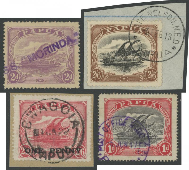 1901-05 British New Guinea Rosettes Watermark Vertical Thin Paper Comb Perf 14 4d black & sepia SG 13b, central 'PORT MORESBY/1-AUG08/PAPUA' cds cancel, Cat £1300. The Thin Paper 4d 6d 1/- & 2/6d were made available only to the Queensland Agent-General in London. A few used examples are recorded, presumably having been sent to Port Moresby with requests for per favour cancellations. The date on this stamp is the day before that on Tim Rybak's example which sold in 2008 for $1323. Chris Ceremuga Certificate (2025) states “contemporary cancel ... only around 270 sold without the Papua overprint, and extremely rare in used condition”. (Image1)