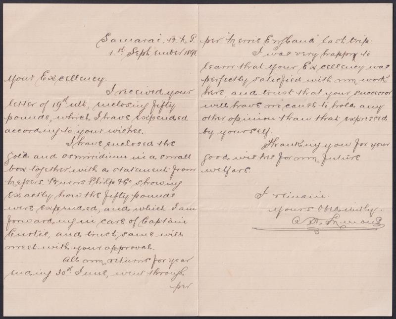 1898 two-page letter headed "Samarai BNG/1st September 1898" to the Governor & signed "AD [?] Murray" who advises he has received £50 in respect of which "...I have enclosed the gold and osmiridium in a small box...with a statement from Burns Philp & Co showing exactly how the fifty pounds were expended..." He also refers to "your successor", which confirms the addressee as Sir William MacGregor, who retired 10.9.1898 and was succeeded by George Le Hunte. With the Burns Philp documentation. Ex Rev Roger Lee.
