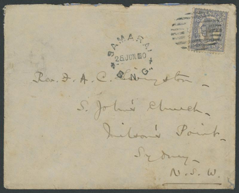 1900 (June 25) MJSW mission envelope with Bishop's Mitre in violet on the back flap, to Sydney with Queensland QV Sidefaces White Background 2d blue solo tied by largely very fine 'BNG'-in-Bars canced and similar 'SAMARAI/B.N.G' unframed cds with fleurons (Lee Type 24) alongside, light Cooktown, Qld & fine Sydney transits and Milson's Point 'JY 6/1900' arrival backstamps, a couple of annotations on the reverse, some repaired edge faults & minor aging/soiling. (Image1)
