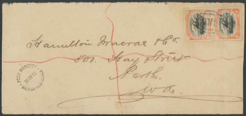 1902 commercial linen-lined cover-front to Perth (WA) with rare franking of BNG 1/- pair (exceptional centring, a little faded but not oxidised, Cat £150+ x15+ on cover) tied by 8-bar 'B.N.G' cancel, fine 'PORT MORESBY/20MY02/BRITISH NEW GUINEA' cds at lower-left, red registration lines but not obviously registered, crease at lower-right and minor blemishes. Very rare: one of the highest non-philatelic BNG Lakatois frankings known.