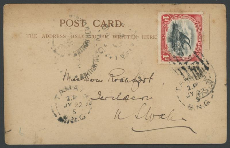 1905 real photo PPC ('Native Constabulary at Cape Nelson') to NSW with BNG 1d tied by 10-bars 'BNG' of Tamata (Lee #49; rated F), two strikes of the 'TAMATA/2P/JY22/5/BNG' cds (#48; rated F) plus transit cds of Samarai & Port Moresby, minor aging. Sold at our auction of 14.8.2010 for $775 (Sale 157 Lot 803). Roger Lee states that postal facilities were transferred to Ioma in "mid-1905". This is the latest item we have recorded from Tamata. (Image1)