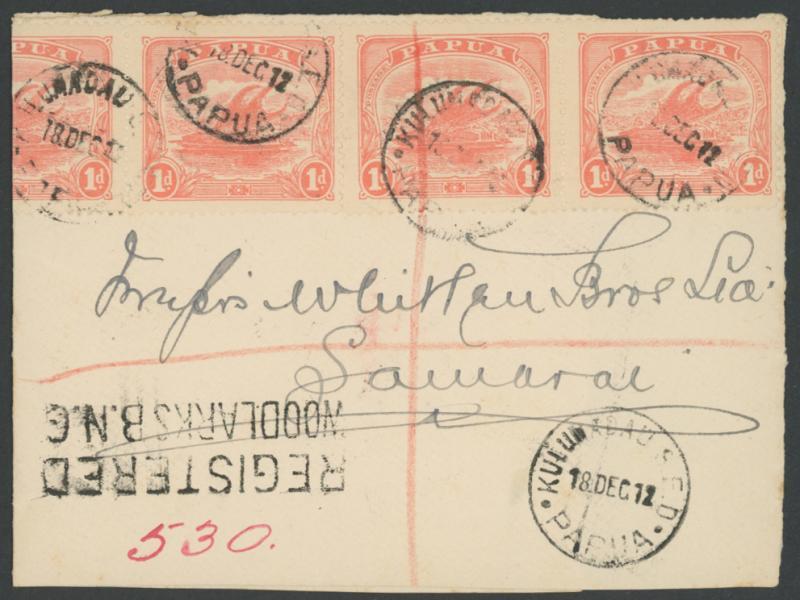 1912 internal commercial large-part cover to Samarai with Monocolours 1d x4 (one folded-over at left) paying the correct rate of 1d + 3d registration tied by 'KULUMADAU SED/18DEC12/PAPUA' cds, very fine 'REGISTERED/WOODLARKS BNG' handstamp (& a lesser strike on the reverse, opened-out & part of the back panel removed. Kulumadau (2) replaced Bonagai late-1907 & continued using the original registration handstamp from Kulumadau (1) - on Woodlarks Island - into the 1920s. (Image1)