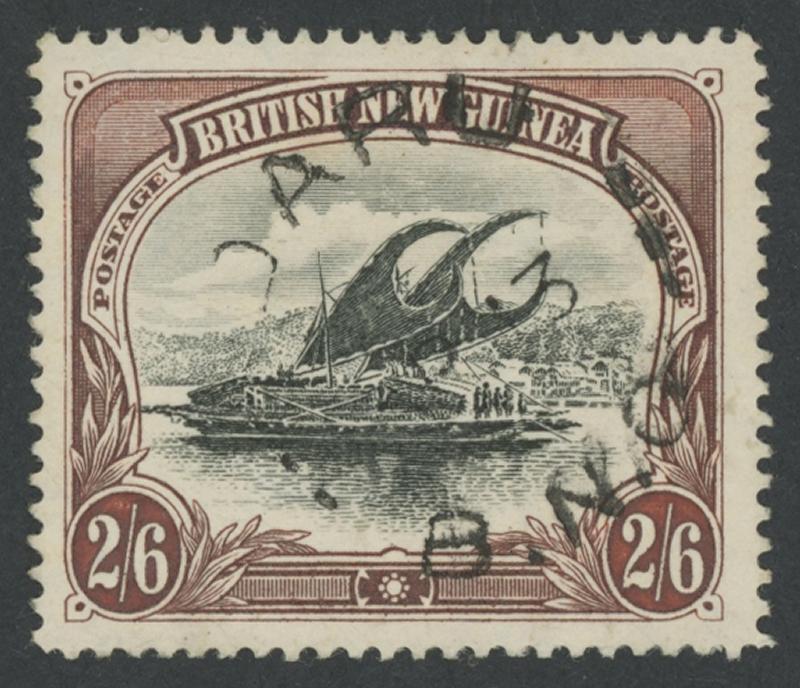 1901-05 British New Guinea Rosettes Watermark Vertical Thin Paper Comb Perf 14 2/6d black & brown SG 16a, light Port Moresby '-4NO05' unframed cds cancel, Cat £1400. The Thin Paper 4d 6d 1/- & 2/6d were made available only to the Queensland Agent-General in London. Only a few used examples are recorded, presumably having been sent to Port Moresby with requests for per favour cancellations. Sold at our auction of 12.10.2012 for $1668 (Sale 176 Lot 712). (Image1)