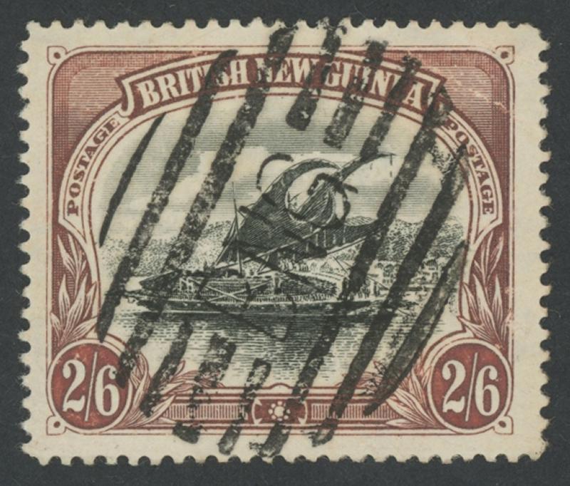 1901-05 British New Guinea Rosettes Watermark Horizontal Thick Paper Line Perf 14 2/6d black & brown SG 8, well-centred, superb central 'BNG' 9-bar canceller of Samarai, Cat £550. (Image1)