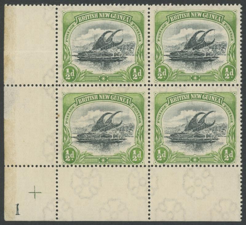 1901-05 British New Guinea Rosettes Watermark Vertical Thick Paper Comb Perf 14 ½d black & yellow-green SG 9 block of 4 from the lower-left corner of the sheet with complete Plate Number '1' below Printers' Guideline Cross in the margin, small hinge remainder in the margin only, the stamps unmounted. Scarce: these were supposed to have been trimmed off. Peter Troy's Plate Number '1' & '2' corner singles sold together in 2009 for $575. (Image1)