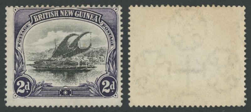 1901-05 British New Guinea Rosettes Watermark Vertical Thin Paper Line Perf 14 2d black & violet SG 11a with Watermark Cross between Rosettes, unused without gum, Cat £65+ for normal mounted mint. See Croaker at page 17-18 for an explanation of the rarity of the 'Watermark Cross' used to signify the centre of the papermarker's sheet (each of which were cut into six printing sheets), and of which he had seen only a handful of examples, all on this issue of the 2d. See also Lot 613120 above & 613127 below. (Image1)