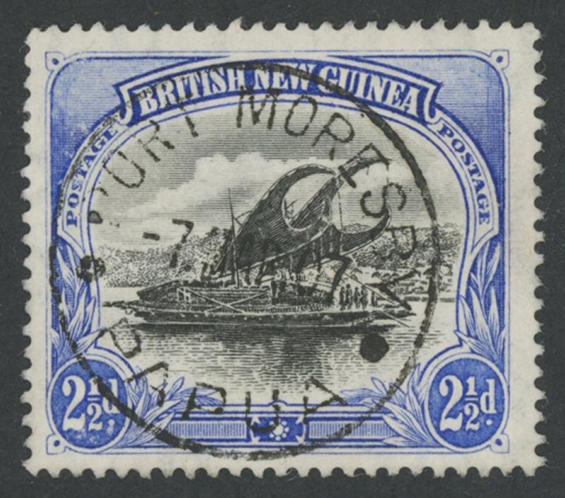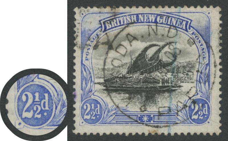 1901-05 British New Guinea Rosettes Watermark Horizontal Thin Paper Line Perf 14 2½d black & ultramarine SG 4a, well-centred, central Port Moresby 1906 unframed cds cancel, Cat £225. Rare & under-rated; most examples seen are misidentified. Submitted to Chris Ceremuga for expertising. (Image1)
