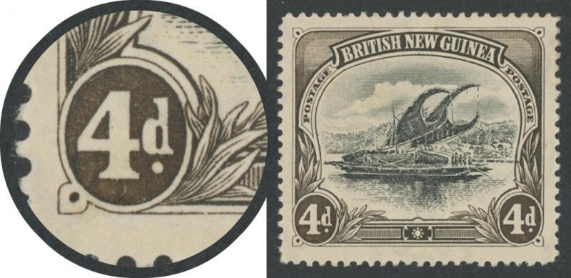 1901-05 British New Guinea Rosettes Watermark Horizontal Thick Paper Perf 14 4d black & sepia with Deformed 'd' at Left [Pos 18] SG 13a, well-centred, lightly mounted, minor gum disturbance, Cat £750. A less well-centred example sold at our auction of 11.12.2024 for $360. (Image1)