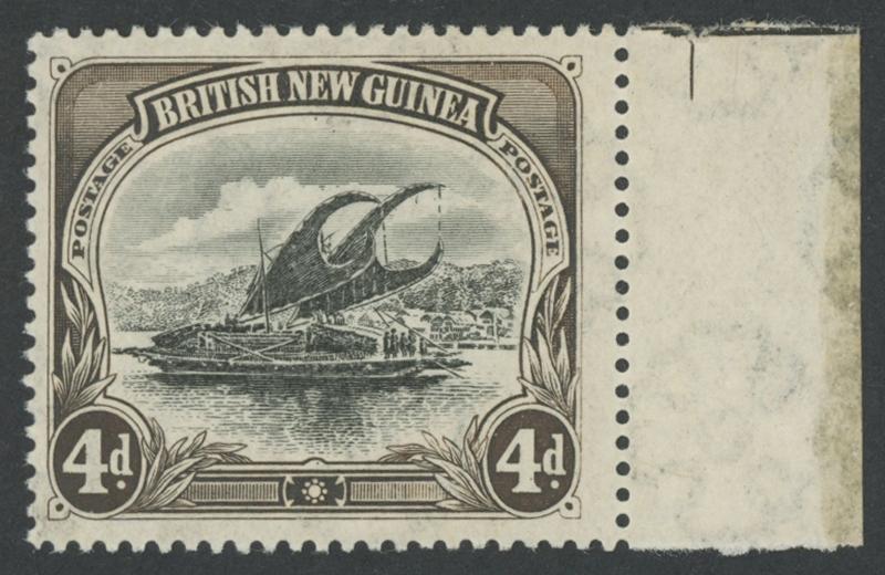 1901-05 British New Guinea Rosettes Watermark Vertical Thin Paper Comb Perf 14 4d black & sepia SG 13b from the centre-right side of the sheet with partial Printers' Guideline Cross in the margin, very lightly mounted, Cat £350. Tim Rybak's unmounted example - also marginal - sold in 2008 for $483. (Image1)
