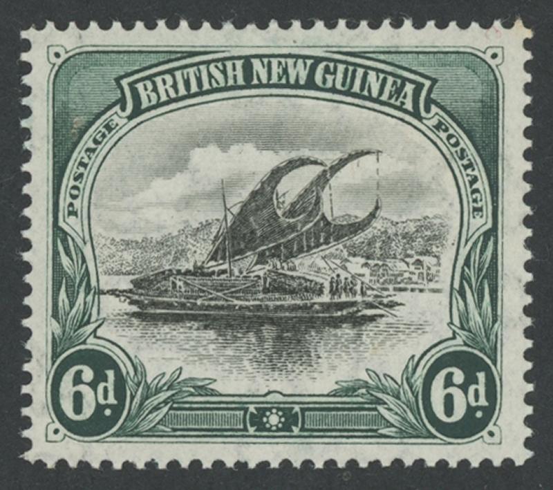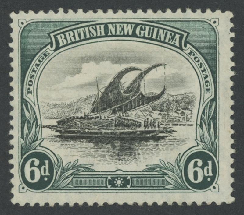 1901-05 British New Guinea Rosettes Watermark Vertical Thin Paper Comb Perf 14 6d black & myrtle-green SG 14a, well-centred, unmounted, Cat £1200+ for mounted. Chris Ceremuga Certificate (2013) states "Superb & fresh", but it does now have just a tiny trace of aging on the upper-right perf tip. Peter Gold's unmounted example sold in 2003 for $1008. (Image1)