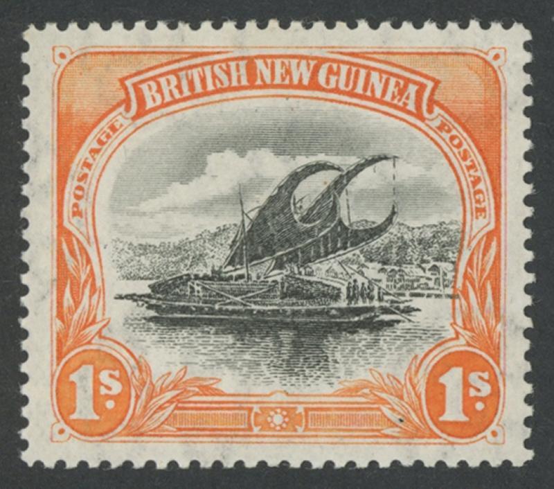 1901-05 British New Guinea Rosettes Watermark Vertical Thin Paper Comb Perf 14 1/- black & orange SG 15a, well-centred, very lightly mounted, Cat £1000. Chris Ceremuga Certificate (2009). Tim Rybak's less well-centred example sold in 2008 for $633 (when Cat £600). (Image1)