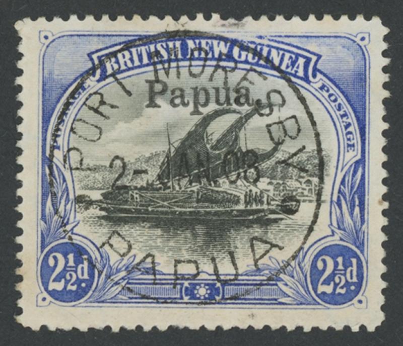 1906 Large 'Papua.' Overprints Rosettes Watermark Horizontal Thick Paper Line Perf 14 2½d black & ultramarine SG 16b, a few slightly uneven perfs, central 'PORT MORESBY/2-JAN.08/PAPUA' cds cancel. Hamilton Croaker does not list this stamp as having received the Large 'Papua.' Gibbons list it used but unpriced & indicate that it is unknown unused. Submitted to Chris Ceremuga for expertising. (Image1)
