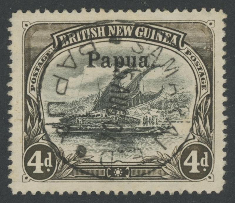 1906 Large 'Papua.' Overprints Rosettes Watermark Horizontal Thick Paper Line Perf 14 4d black & sepia SG 17, well-centred, light central Samarai 1907 cds cancel, Cat £180. (Image1)