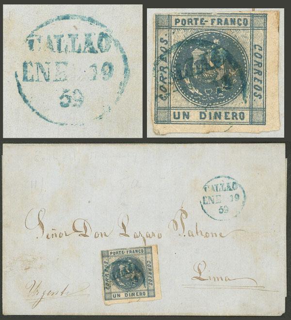 Yvert 4 (Sc.7), 1859 1D. gray-blue, franking a folded cover sent from Callao to Lima on 19/JA/1859, VF quality! (Image)