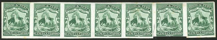 Sc.16, 1866 Llama, proof on very thin paper (India), splendid strip of 7 stamps (one with small fault, short below), excellent and rare! (Image)