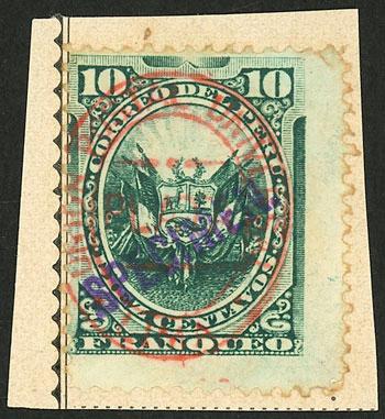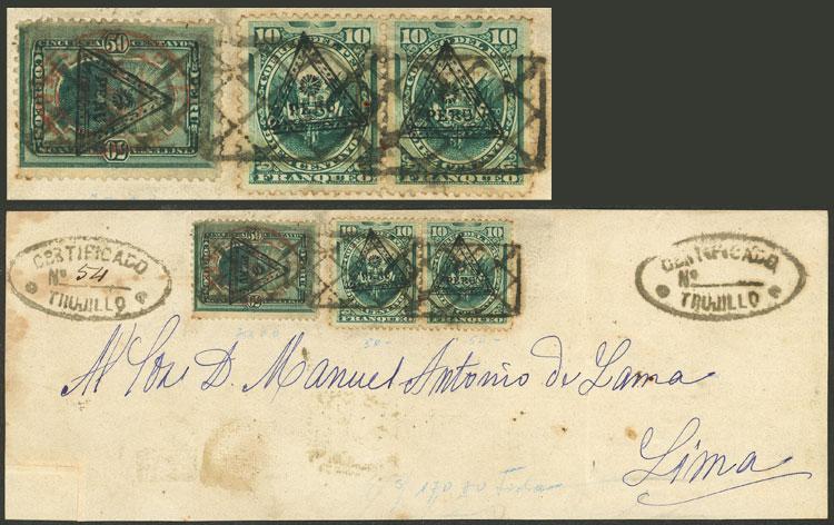 Sc.77, 1883 50c. with double overprint: "PLATA-PERU" in red and black triangle + pair of 10c. with triangular overprint, on fragment of a registered cover with quadruple rating sent from Trujillo to Lima (rate 40c. + 30c. registration), VF quality! (Image)
