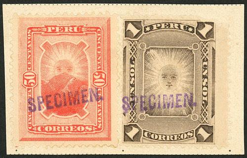Sc.114/115, 1886 50c. and 1S., high values of the set overprinted SPECIMEN by the post office of Natal after receiving them from the UPU as samples, extremely rare and unique. NOTE: The Natal post office mounted on album pages the stamps it received from the UPU and applied these manual overprints to all of them. Each stamp bearing this overprint is therefore unique and unrepeatable. We include a photocopy of a certificate of the B.P.A. made for several stamps, including these items. (Image)