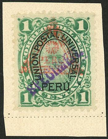 Sc.117A, 1889 10c. green with red "Unión Postal Universal - Lima" overprint, also overprinted SPECIMEN by the post office of Natal after receiving them from the UPU as samples, extremely rare and unique. NOTE: The Natal post office mounted on album pages the stamps it received from the UPU and applied these manual overprints to all of them. Each stamp bearing this overprint is therefore unique and unrepeatable. We include a photocopy of a certificate of the B.P.A. made for several stamps, including this item. (Image)