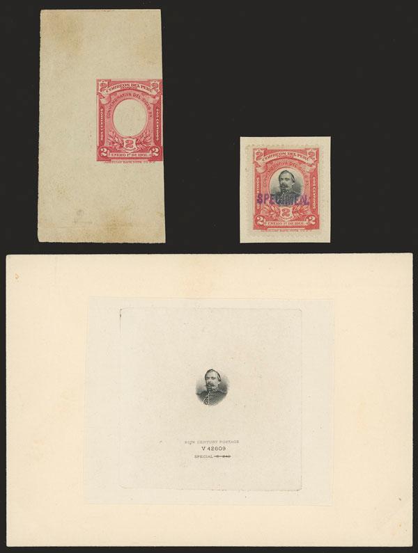 Sc.162, 1901 2c. Cnel. Francisco Bolognesi, stamp with SPECIMEN overprint + die proofs of the center engraved and the frame litographed, excellent and extremely rare lot! (Image)