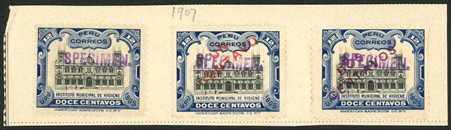 Sc.165/167, 1905 Institute of Hygiene 12c. + overprinted values of 1c. and 2c., the 3 overprinted SPECIMEN by the post office of Natal after receiving them from the UPU as samples, extremely rare and unique. NOTE: The Natal post office mounted on album pages the stamps it received from the UPU and applied these manual overprints to all of them. Each stamp bearing this overprint is therefore unique and unrepeatable. (Image)