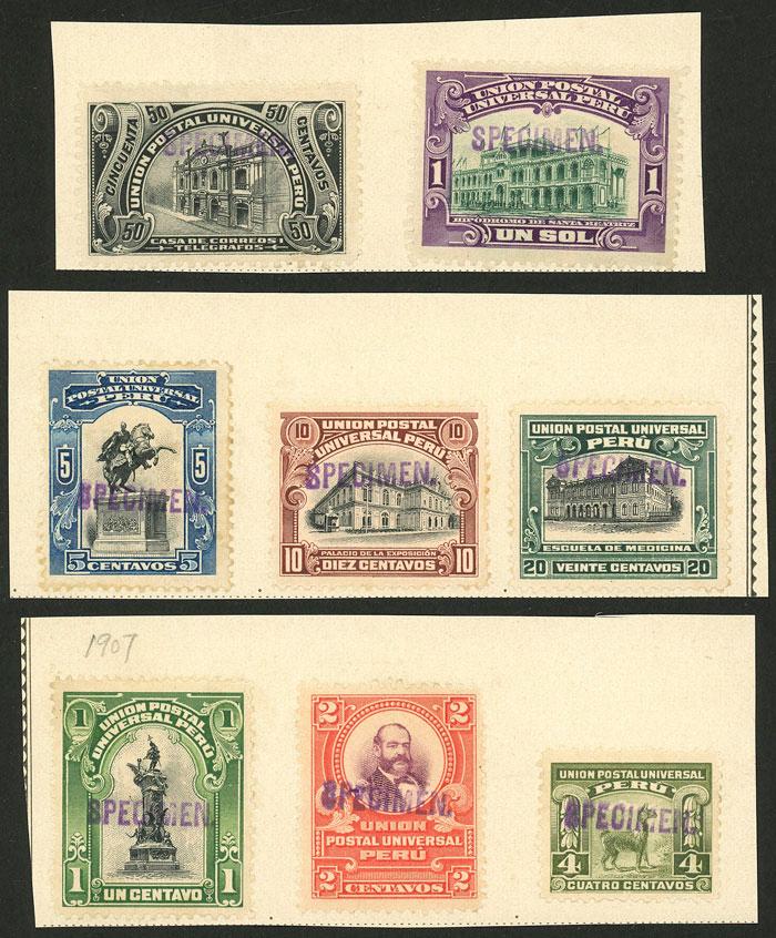 Sc.168/175 (without 176), the 8 values of the set (without the 2S) overprinted SPECIMEN by the post office of Natal after receiving them from the UPU as samples, extremely rare and unique. NOTE: The Natal post office mounted on album pages the stamps it received from the UPU and applied these manual overprints to all of them. Each stamp bearing this overprint is therefore unique and unrepeatable. With certificate of the B.P.A. (Image)