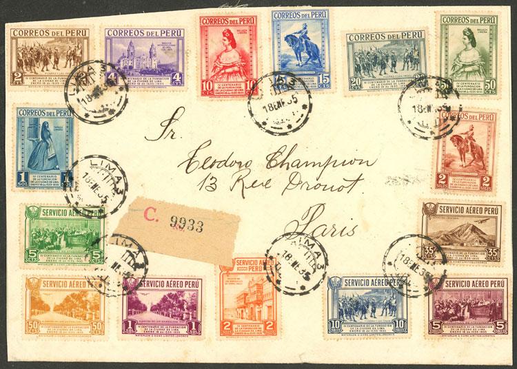 Sc.324/331 + C6/12, 1935 Lima 400 years, complete set of 15 values on a registered cover sent to France, on back transit marks of Cristobal, New York, and Paris arrival of 31/JA, very attractive! (Image)