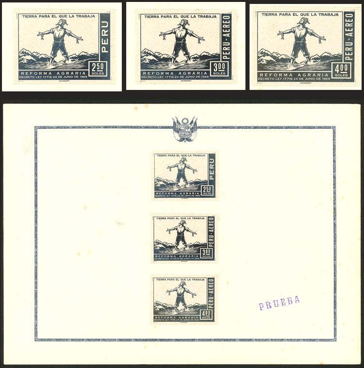 Sc.519 + C246/7, 1969 Land Reform, complete set of 3 values, photographic PROOFS in black + card with set of issued stamps with first day postmark, very attractive lot! (Image)