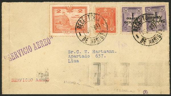 Yvert 1, 1927 50c. "Marinerito" (second printing), 2 stamps + 12c. definitives to pay the postage of a cover front sent from MASISEA to Lima, excellent quality! (Image)
