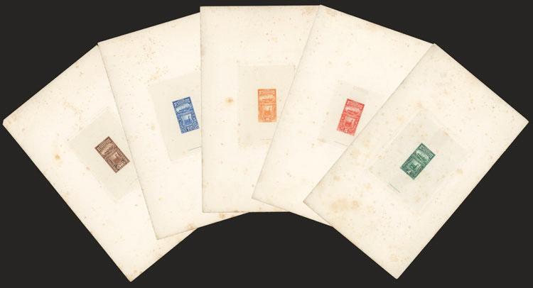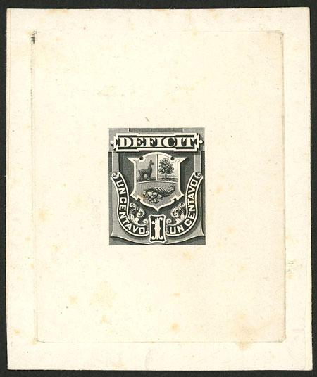 Sc.J2/J5, 1874 Llama and steamship, 5 DIE ESSAYS printed on thin paper affixed to card, with value of 2c. unissued, fine to very fine quality (with some oxidation spots of little importance), very rare! (Image)