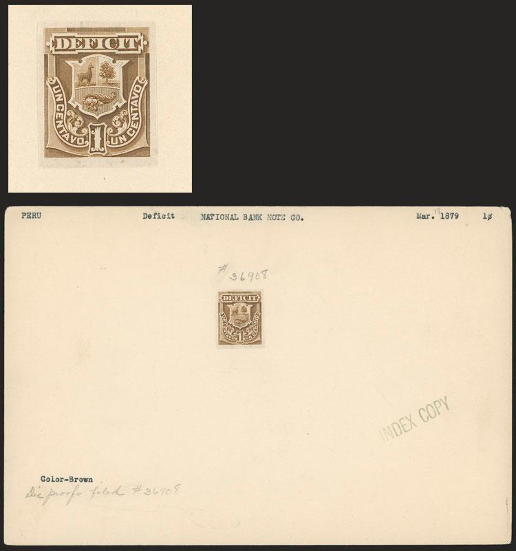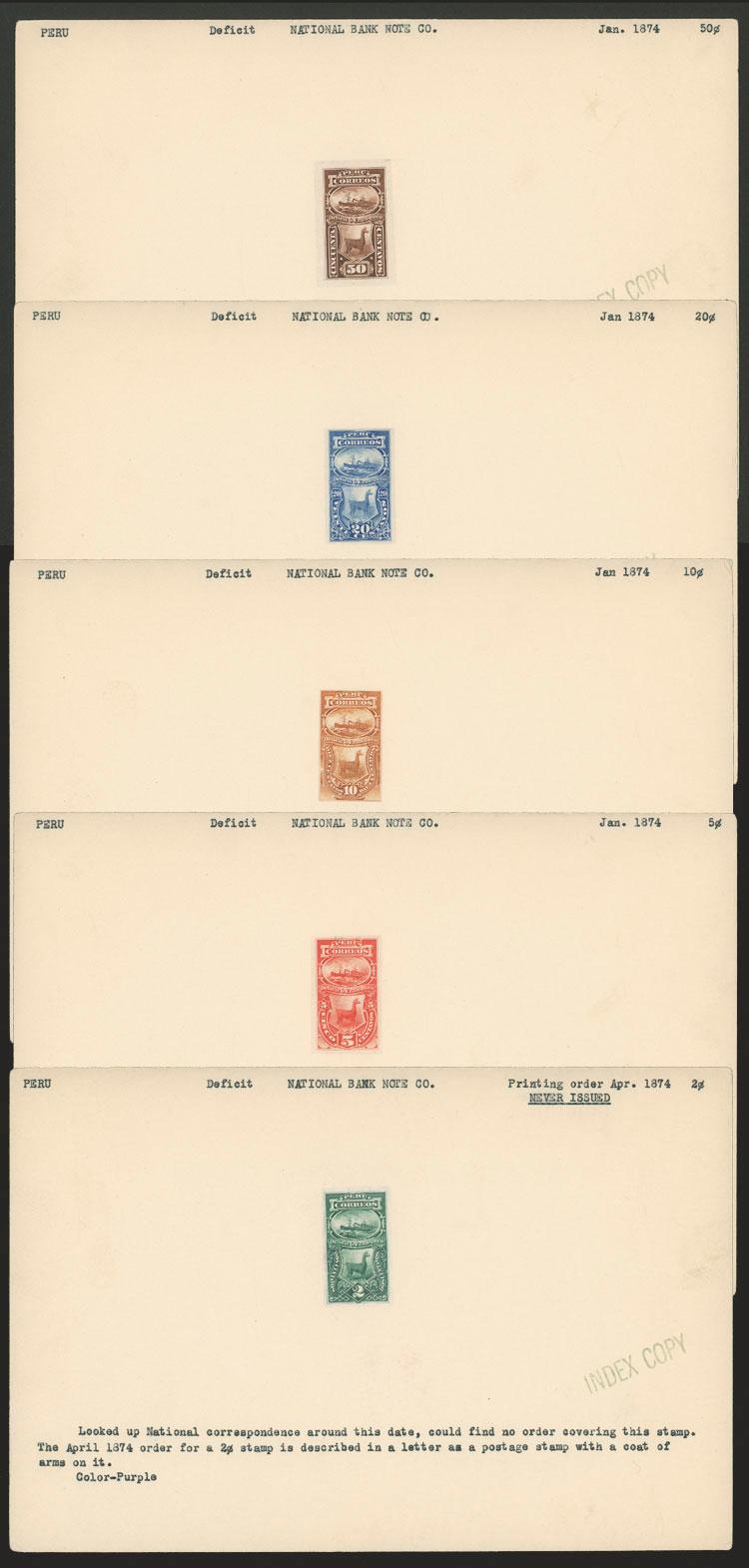 Sc.J2/J5, 1874 Llama and steamship, 5 DIE ESSAYS printed on thin paper, cut out and affixed to file cards of the National Bank Note Co., with value of 2c. unissued, excellent quality, very rare! (Image)