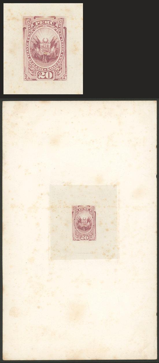 Year 1876, 20c. Coat of arms, unadopted essay of the National Bank Note Co., die essay printed on thin paper affixed to card, light oxidation stains else very fine, very rare! (Image)