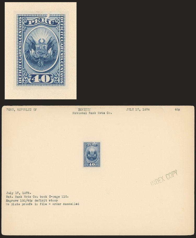 Year 1876, 40c. Coat of arms, unadopted essay of the National Bank Note Co., die essay cut out and affixed to a file card of the printer, with small defect but very rare and fine appearance! (Image)