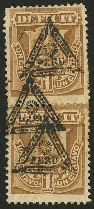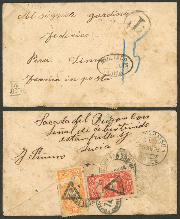 Cover sent from Buenos Aires to Lima on 1/DE/1893 originally franked, with inscription on back, over the flap: "Taken from the mailbox showing signs of having had stamps and being dirty, J. Piñeiro," and for that reason it was forwarded to Lima with transit mark of Valparaiso on 6/DE, and on arrival in Lima it received postage dues for 15c. (Sc.J23 + J24), very interesting, ex-Herbert Moll. (Image)