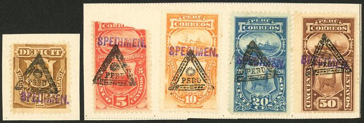 Sc.J22/J26, 1884 complete set of 5 values with triangular overprint (the 5c. defective), also overprinted SPECIMEN by the post office of Natal after receiving them from the UPU as samples, extremely rare and unique. NOTE: The Natal post office mounted on album pages the stamps it received from the UPU and applied these manual overprints to all of them. Each stamp bearing this overprint is therefore unique and unrepeatable. We include a photocopy of a certificate of the B.P.A. made for several stamps, including these items. (Image)