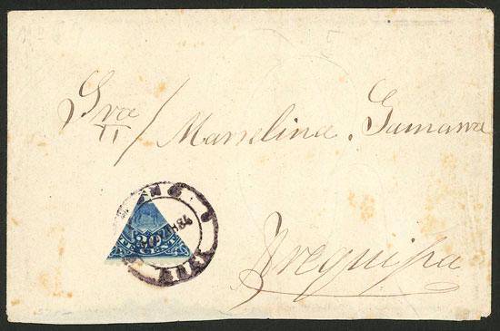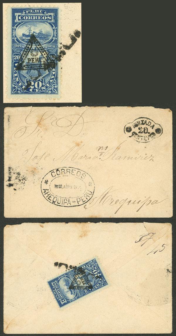 Sc.J25, 1884 20c. blue with triangular overprint, used to pay the charge of a cover received without postage in Arequipa in AP/1887, excellent quality, very rare, ex-Herbert Moll. (Image)