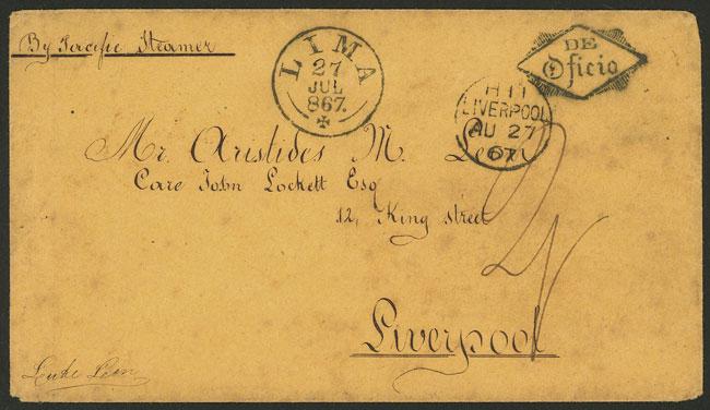 Cover sent from Lima to England on 27/JUL/1867, without franking, with the marks "DE OFICIO", datestamp of Lima, and arrival of 27/AU (all on front!), and on back transit of London in red, VF quality, rare! (Image)