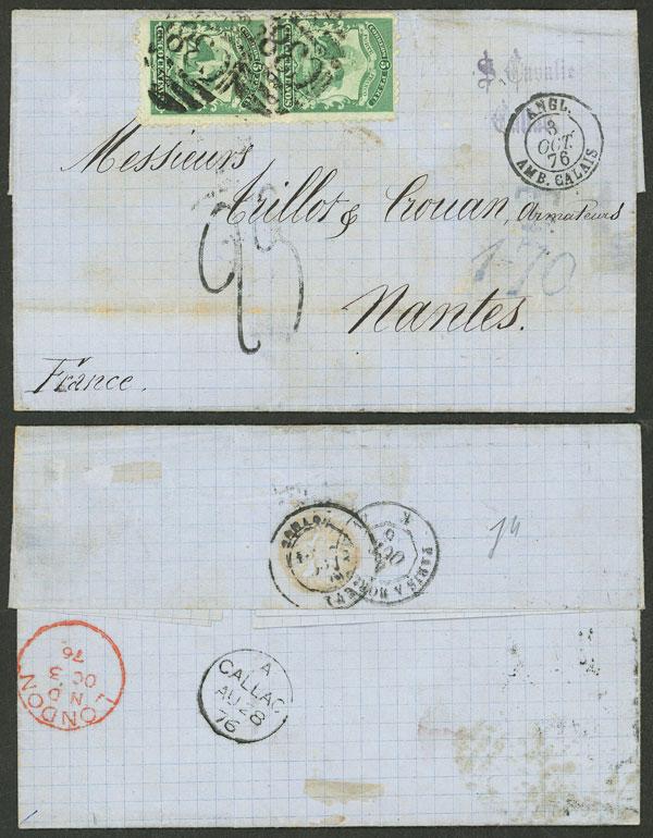 27/AU/1876 Callao to France, entire letter franked with 10c. (pair Sc.16), it was handed directly to the British Consulate and there the Peruvian stamps were cancelled with the mark "C38", it bears several interesting marks on front and back, excellent quality, ex-Herbert Moll (Image)