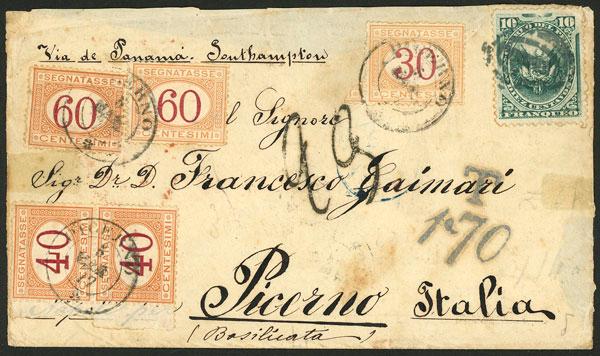 Cover sent to Italy in 1877 franked with 10c. and postmark of TACNA, sent by British mail (transit of London 1/MAR/1877), on arrival in Picerno it received Italian postage due stamps for 2.30L., very attractive! (Image)
