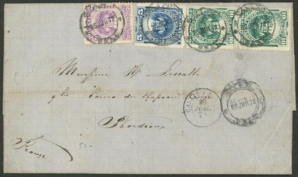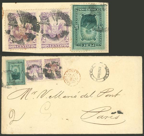 Entire letter sent on 25/JUN/1879 (ONLY 8 DAYS AFTER PERU´S ACCESSION TO THE UPU) from Callao to France franked with the new international rate of 27c., with transit through Calais on 28/JUL, and on back Bordeaux arrival mark of the following day. Excellent quality, ex-Herbert Moll. The new postal rate for letters to Europe was 11c. (of which 1c. paid the transit across the Isthmus of Panama). This amount was expressed in Moneda de Plata, for which no stamps yet existed, and the equivalent in Papel Moneda was 27c. or 30c., coinciding with the outbreak of the war with Chile in 1879. In 1880 the stamps were overprinted "Unión Postal Universal Plata Perú". (Image)
